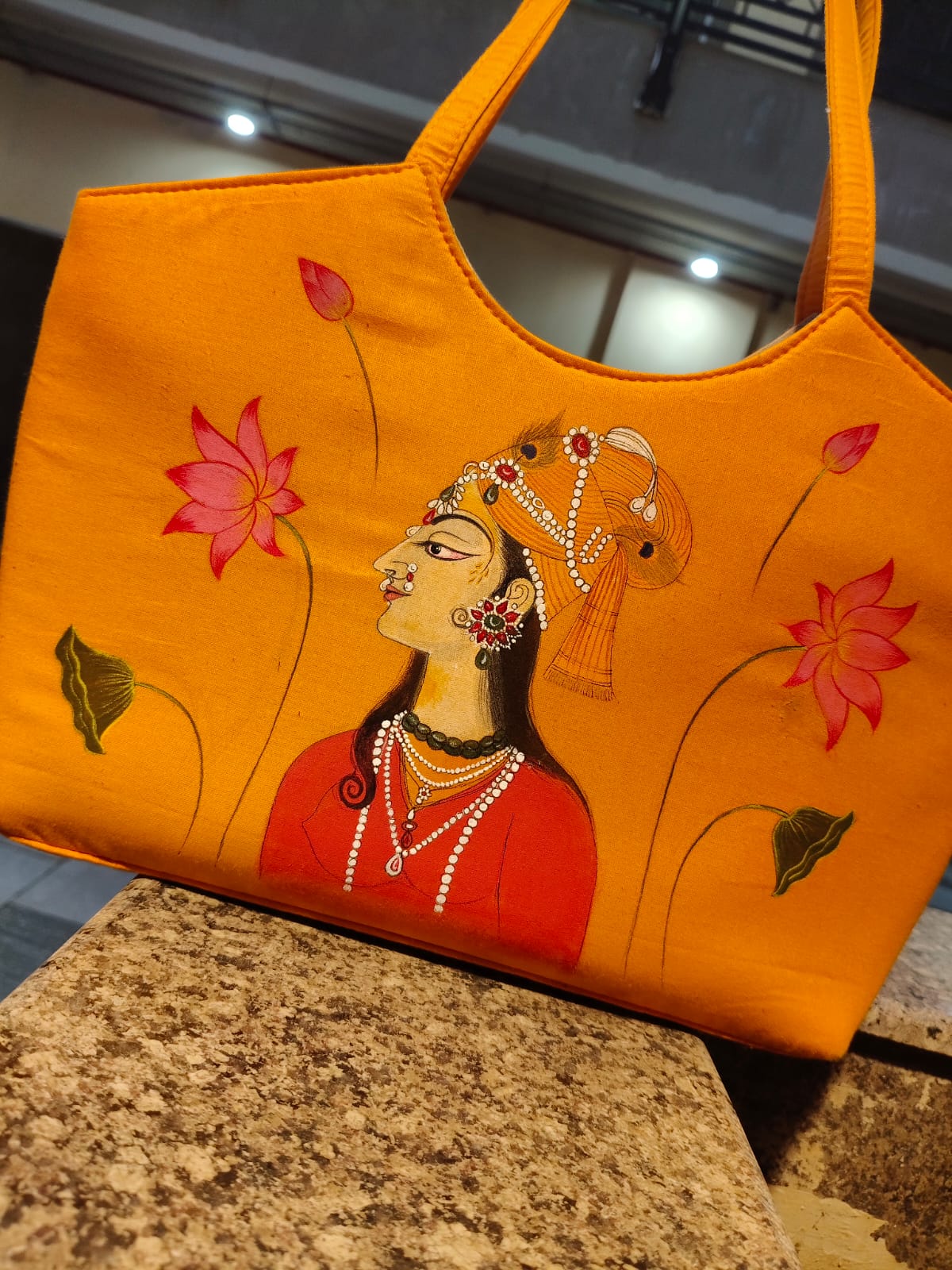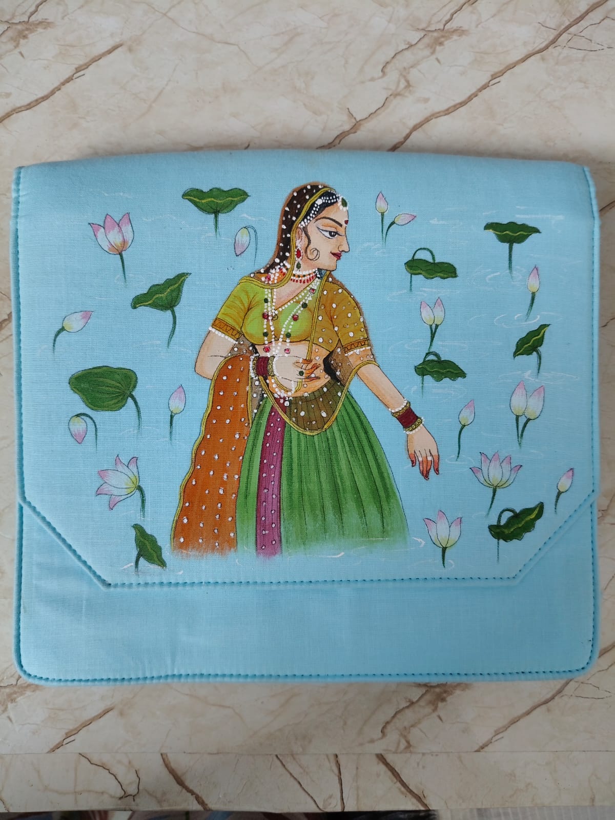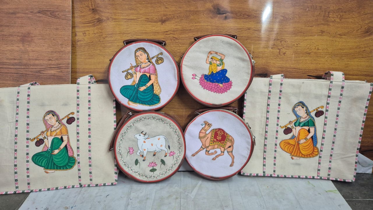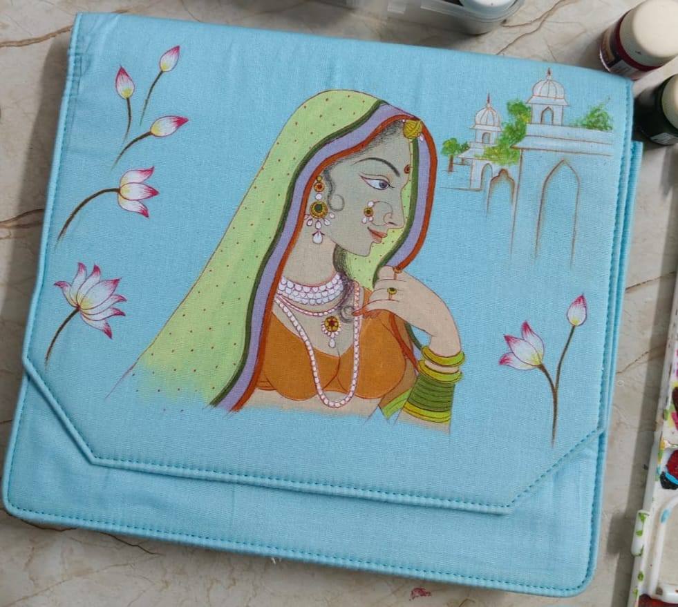 Here we are introducing a range of designer bags , which are handcrafted with exclusive Miniature artworks so that the folk art can be more acceptable in a form which is widely used among women. As the folk art widely depicts the relationships between men and women and different styles of women , we at Mugdha’s Graffiti Arena present before you –‘Ada‘, the feminine style of carrying oneself, with an art piece which speaks volumes about the rich heritage of Rajasthan.